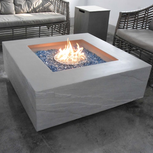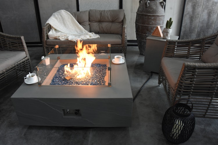 Die rechteckige Gas Feuerstelle Carpertee in Sandstein-Optik grau verfügt über eine leistungsstarke Brenneinheit in der Mitte der Feuerstelle, diese ermöglicht ein einzigartiges Flammenspiel. Das mitgelieferte Deko-Glassplitt verleiht dem Feuerspiel ein schönes Funkeln. Dank der glatten Oberfläche kann die elegante Gas Feuerstelle nicht nur als Deko-Element, sondern auch als Tisch bzw. eine Ablagefläche genutzt werden. Genießen Sie die einzigartige Atmosphäre und das funkelnde Flammenspiel in Ihrem Wohlfühlbereich auf der Terrasse oder im Garten.