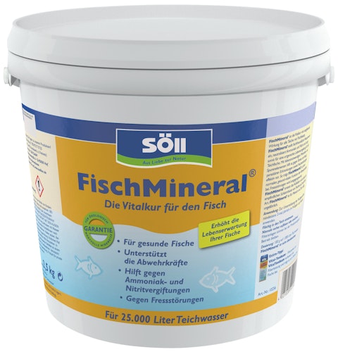 FischMineral ist die Vitalkur mit entgiftender Wirkung für alle Teiche mit Fischbesatz. FischMineral stellt fischfreundliche Wasserwerte ein, neutralisiert Ammoniak und Nitrit und sorgt somit für eine artgerechte Lebensumgebung für alle Teichfische. Mit lebensnotwendigen Mineralien und Spurenelementen hilft es gegen Stress und beugt parasitären Erkrankungen sowie Hautverpilzungen effektiv vor. So trägt FischMineral zu einer normalen, gesund-vitalen Funktion der Abwehrkräfte bei.  FischMineral ersetzt das Aufsalzen und schützt die empfindlichen Schleimhäute von Fischen auf natürliche Art.