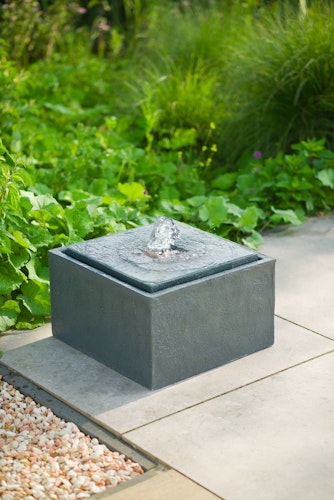 • Modernes, anthrazitfarbenes Wasserspiel mit klarer Linienführung